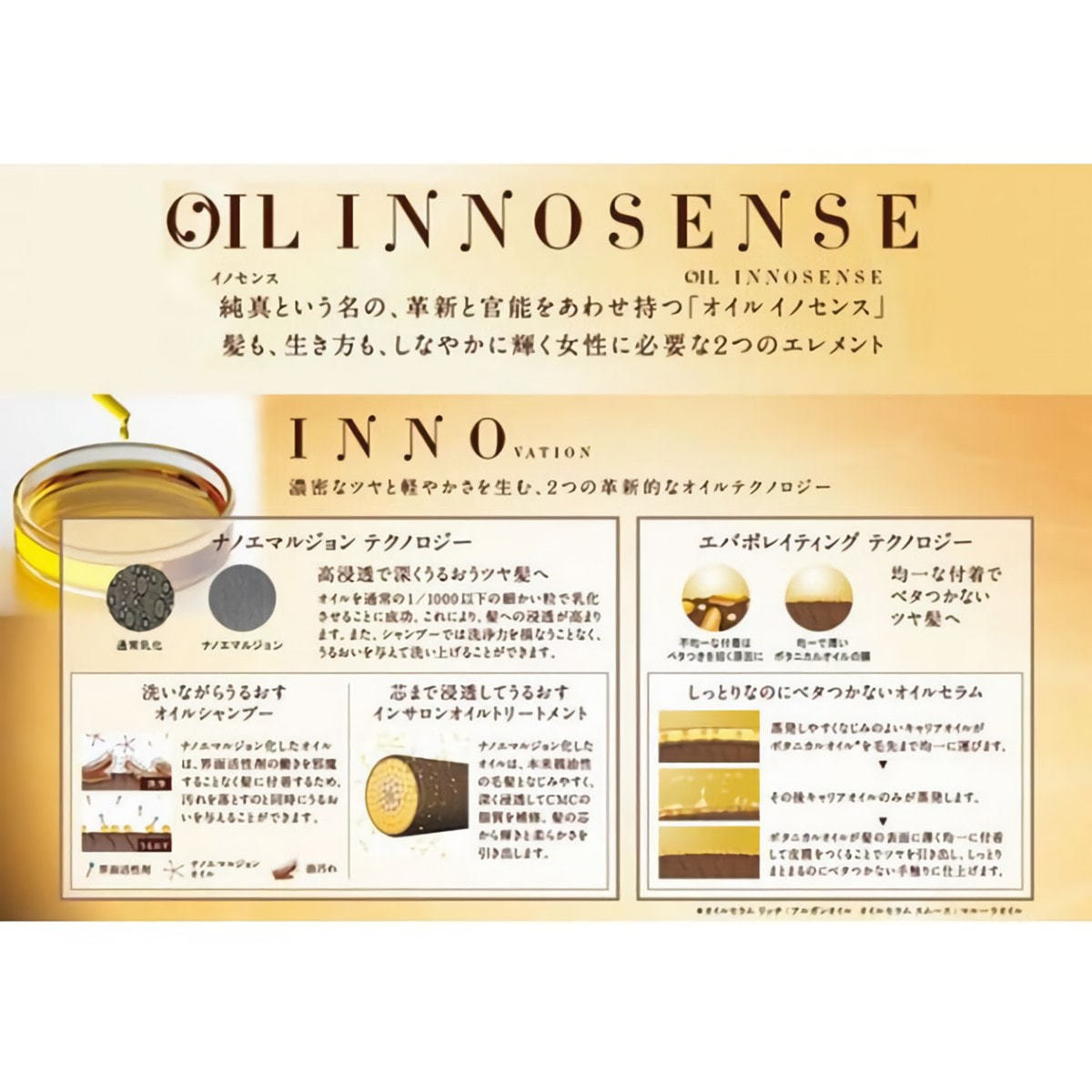 ナノエマルジョン化したオイルが髪に深く浸透しケア成分を補いながら水分を閉じ込め、黄金のきらめきをまとったツルツルのツヤ髪に導きます。