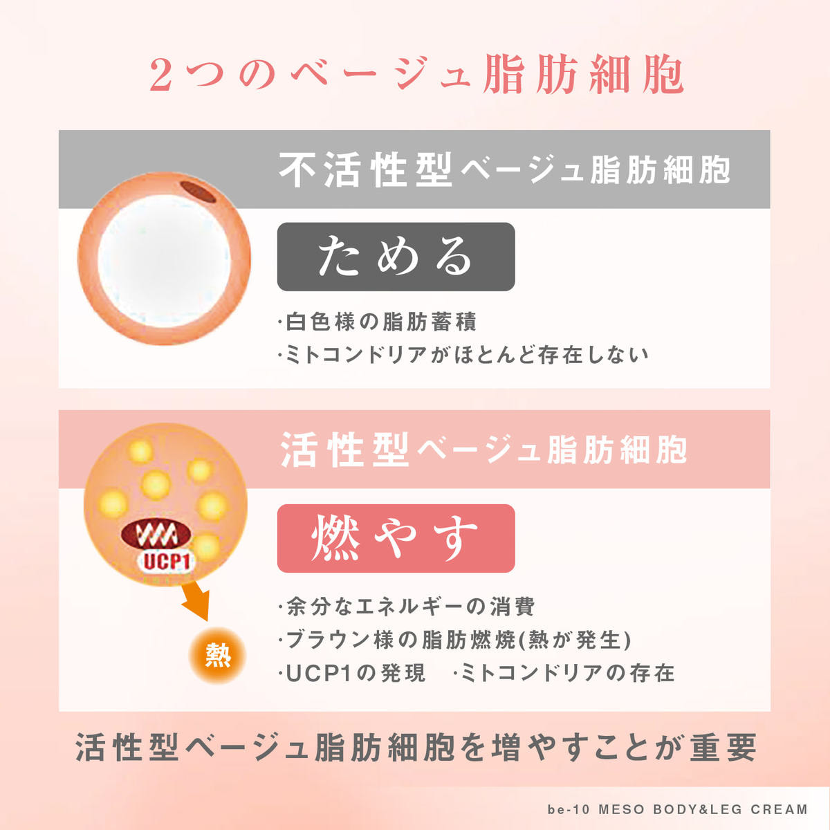 また、ベージュ脂肪細胞を活性化するために、白色細胞におけるUCP1の発現を高めます。